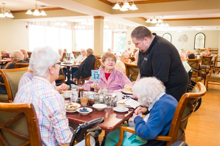 Residents gather three times a day for hot, freshly prepared meals featuring rotating specials and favorites.